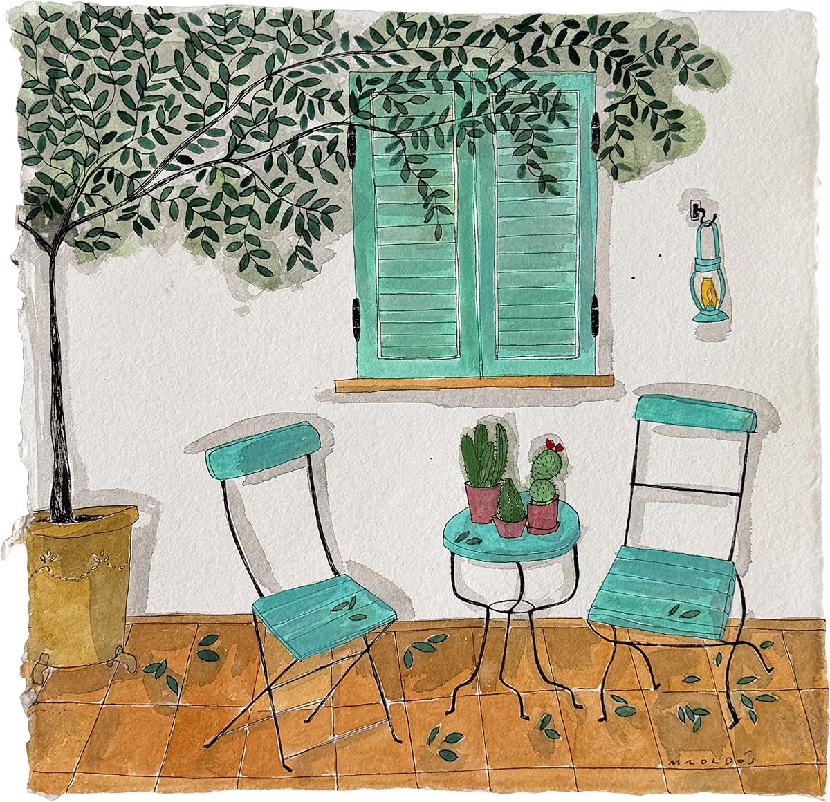 Two chairs in front of green-blue blinds (61.2.1)